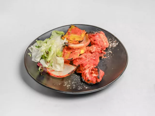 In Tandoori-Soße marinierte Lammkoteletts, Hähnchenfilet und Fisch im Tondoor gegrillt - serviert auf Basmatireis.